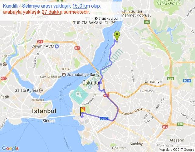 Kandilli - Selimiye arası yaklaşık olarak 90 km/h ile yukarıda belirtilen sürede olup, iki yerin kuş uçuşu uzaklığı (mesafesi) 8'dir. Yolculuk otobüsle 35 dakika sürmektedir.