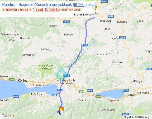 Kandıra - Başiskele Kocaeli arası yaklaşık olarak 90 km/h ile yukarıda belirtilen sürede olup, iki yerin kuş uçuşu uzaklığı (mesafesi) 52'dir. Yolculuk otobüsle 1 saat 31 dakika sürmektedir.