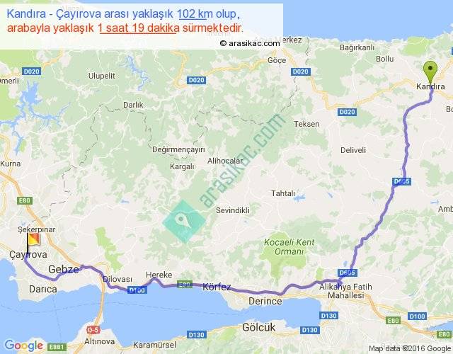 Kandıra - Çayırova arası yaklaşık olarak 90 km/h ile yukarıda belirtilen sürede olup, iki yerin kuş uçuşu uzaklığı (mesafesi) 71'dir. Yolculuk otobüsle 1 saat 42 dakika sürmektedir.
