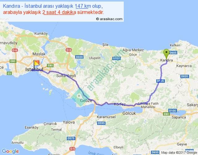 Kandıra - İstanbul arası yaklaşık olarak 90 km/h ile yukarıda belirtilen sürede olup, iki yerin kuş uçuşu uzaklığı (mesafesi) 98'dir. Yolculuk otobüsle 2 saat 41 dakika sürmektedir.