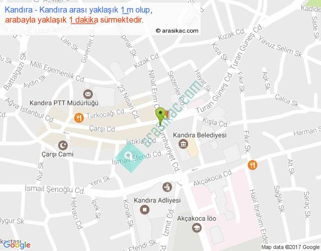 Kandıra - Kandıra arası yaklaşık olarak 90 km/h ile yukarıda belirtilen sürede olup, iki yerin kuş uçuşu uzaklığı (mesafesi) 0'dir. Yolculuk otobüsle 1 dakika sürmektedir.