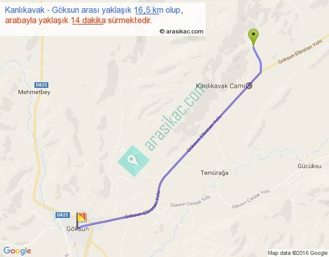 Kanlıkavak - Göksun arası yaklaşık olarak 90 km/h ile yukarıda belirtilen sürede olup, iki yerin kuş uçuşu uzaklığı (mesafesi) 15'dir. Yolculuk otobüsle 18 dakika sürmektedir.