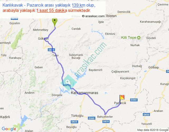 Kanlıkavak - Pazarcık arası yaklaşık olarak 90 km/h ile yukarıda belirtilen sürede olup, iki yerin kuş uçuşu uzaklığı (mesafesi) 91'dir. Yolculuk otobüsle 2 saat 29 dakika sürmektedir.