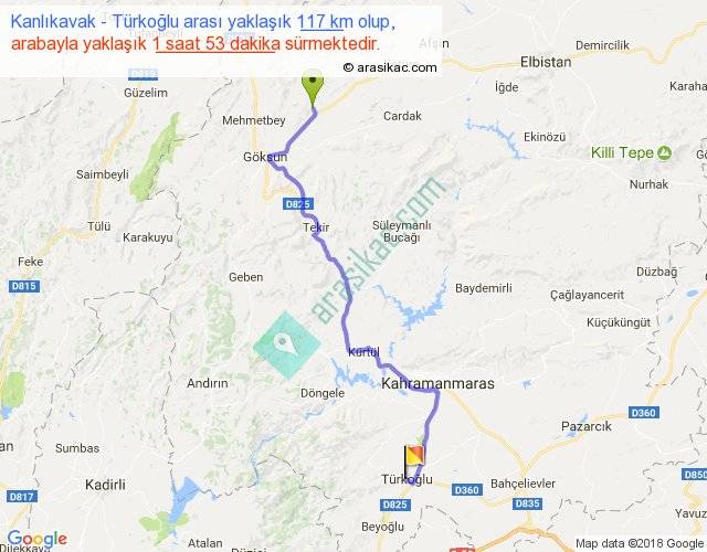 Kanlıkavak - Türkoğlu arası yaklaşık olarak 90 km/h ile yukarıda belirtilen sürede olup, iki yerin kuş uçuşu uzaklığı (mesafesi) 83'dir. Yolculuk otobüsle 2 saat 26 dakika sürmektedir.