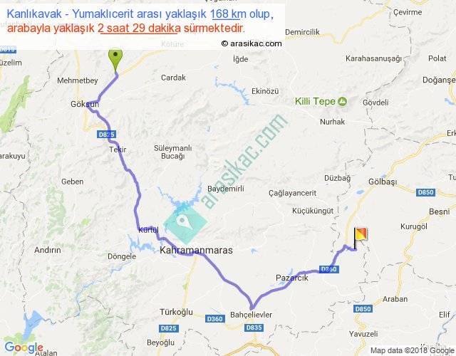 Kanlıkavak - Yumaklıcerit arası yaklaşık olarak 90 km/h ile yukarıda belirtilen sürede olup, iki yerin kuş uçuşu uzaklığı (mesafesi) 100'dir. Yolculuk otobüsle 3 saat 13 dakika sürmektedir.