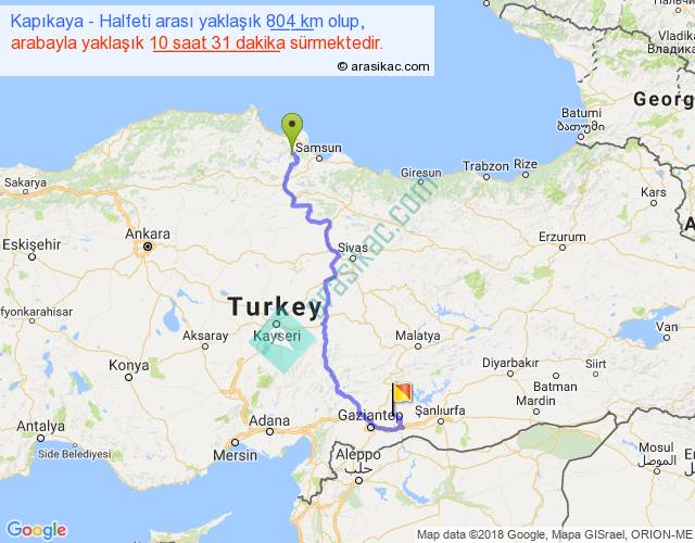 Kapıkaya - Halfeti arası yaklaşık olarak 90 km/h ile yukarıda belirtilen sürede olup, iki yerin kuş uçuşu uzaklığı (mesafesi) 489'dir. Eğer belirtilen yerler arasında uçak seferi var ise bu süre uçakla 45 dakika'ya kadar düşebilir. Yolculuk otobüsle 13 saat 40 dakika sürmektedir.