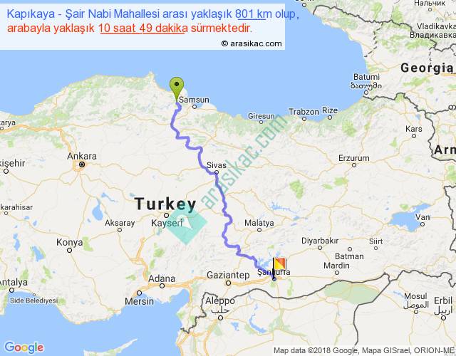 Kapıkaya - Şair Nabi Mahallesi arası yaklaşık olarak 90 km/h ile yukarıda belirtilen sürede olup, iki yerin kuş uçuşu uzaklığı (mesafesi) 531'dir. Eğer belirtilen yerler arasında uçak seferi var ise bu süre uçakla 49 dakika'ya kadar düşebilir. Yolculuk otobüsle 14 saat 3 dakika sürmektedir.