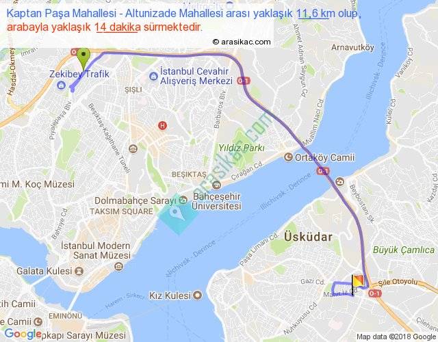 Kaptan Paşa Mahallesi - Altunizade Mahallesi arası yaklaşık olarak 90 km/h ile yukarıda belirtilen sürede olup, iki yerin kuş uçuşu uzaklığı (mesafesi) 7'dir. Yolculuk otobüsle 18 dakika sürmektedir.