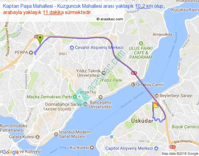 Kaptan Paşa Mahallesi - Kuzguncuk Mahallesi arası yaklaşık olarak 90 km/h ile yukarıda belirtilen sürede olup, iki yerin kuş uçuşu uzaklığı (mesafesi) 6'dir. Yolculuk otobüsle 14 dakika sürmektedir.