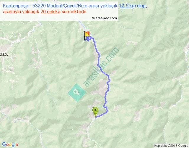 Kaptanpaşa - 53220 Madenli Çayeli Rize arası yaklaşık olarak 90 km/h ile yukarıda belirtilen sürede olup, iki yerin kuş uçuşu uzaklığı (mesafesi) 8'dir. Yolculuk otobüsle 26 dakika sürmektedir.