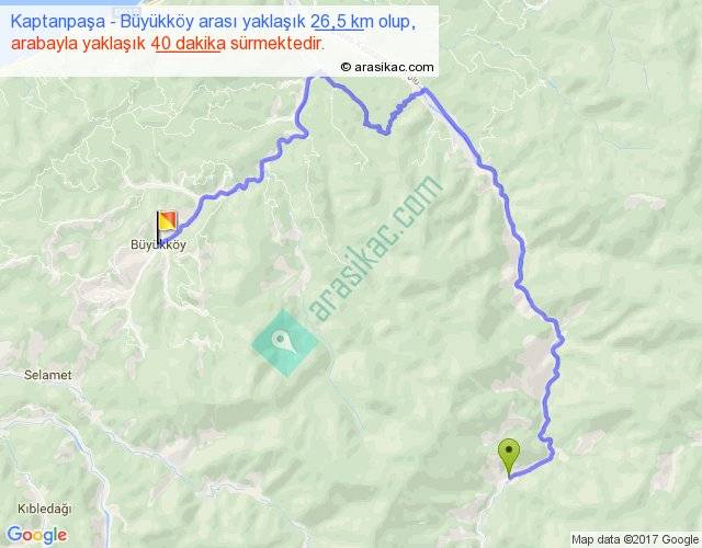 Kaptanpaşa - Büyükköy arası yaklaşık olarak 90 km/h ile yukarıda belirtilen sürede olup, iki yerin kuş uçuşu uzaklığı (mesafesi) 11'dir. Yolculuk otobüsle 52 dakika sürmektedir.