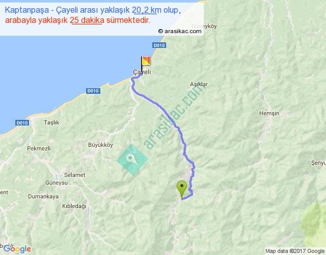 Kaptanpaşa - Çayeli arası yaklaşık olarak 90 km/h ile yukarıda belirtilen sürede olup, iki yerin kuş uçuşu uzaklığı (mesafesi) 15'dir. Yolculuk otobüsle 32 dakika sürmektedir.