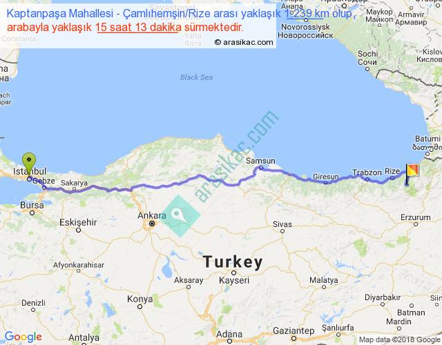 Kaptanpaşa Mahallesi - Çamlıhemşin Rize arası yaklaşık olarak 90 km/h ile yukarıda belirtilen sürede olup, iki yerin kuş uçuşu uzaklığı (mesafesi) 1004'dir. Eğer belirtilen yerler arasında uçak seferi var ise bu süre uçakla 1 saat 32 dakika'ya kadar düşebilir. Yolculuk otobüsle 19 saat 46 dakika sürmektedir.