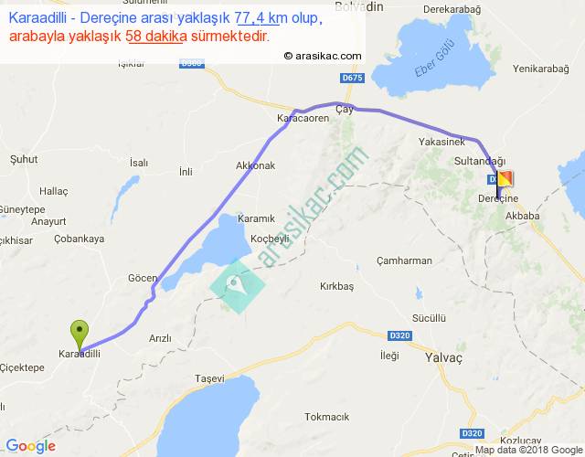 Karaadilli - Dereçine arası yaklaşık olarak 90 km/h ile yukarıda belirtilen sürede olup, iki yerin kuş uçuşu uzaklığı (mesafesi) 58'dir. Yolculuk otobüsle 1 saat 15 dakika sürmektedir.