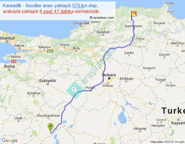 Karaadilli - Seydiler arası yaklaşık olarak 90 km/h ile yukarıda belirtilen sürede olup, iki yerin kuş uçuşu uzaklığı (mesafesi) 450'dir. Eğer belirtilen yerler arasında uçak seferi var ise bu süre uçakla 41 dakika'ya kadar düşebilir. Yolculuk otobüsle 8 saat 49 dakika sürmektedir.