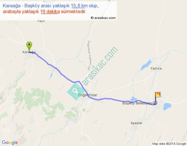 Karaağa - Başköy arası yaklaşık olarak 90 km/h ile yukarıda belirtilen sürede olup, iki yerin kuş uçuşu uzaklığı (mesafesi) 14'dir. Yolculuk otobüsle 24 dakika sürmektedir.