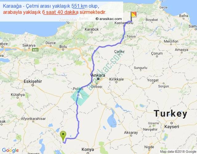 Karaağa - Çetmi arası yaklaşık olarak 90 km/h ile yukarıda belirtilen sürede olup, iki yerin kuş uçuşu uzaklığı (mesafesi) 421'dir. Eğer belirtilen yerler arasında uçak seferi var ise bu süre uçakla 38 dakika'ya kadar düşebilir. Yolculuk otobüsle 8 saat 40 dakika sürmektedir.