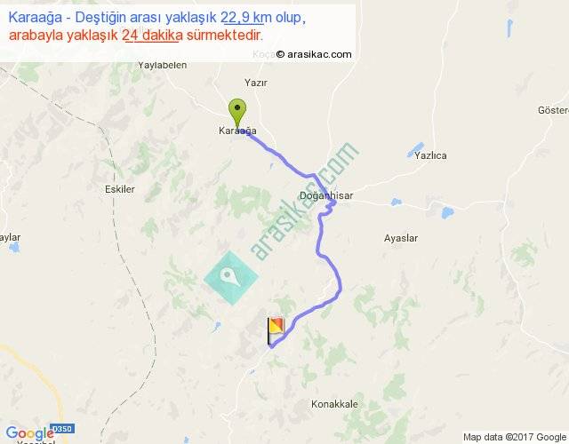 Karaağa - Deştiğin arası yaklaşık olarak 90 km/h ile yukarıda belirtilen sürede olup, iki yerin kuş uçuşu uzaklığı (mesafesi) 15'dir. Yolculuk otobüsle 31 dakika sürmektedir.