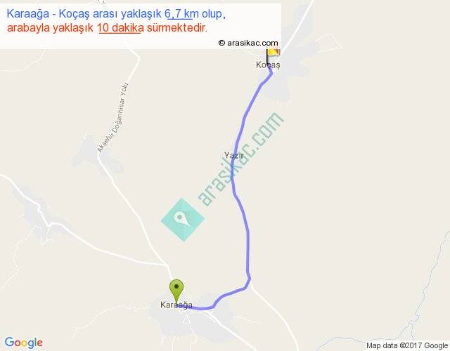 Karaağa - Koçaş arası yaklaşık olarak 90 km/h ile yukarıda belirtilen sürede olup, iki yerin kuş uçuşu uzaklığı (mesafesi) 5'dir. Yolculuk otobüsle 13 dakika sürmektedir.