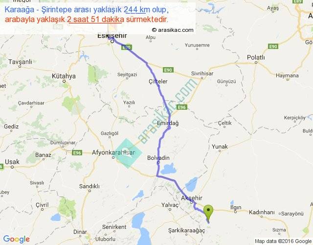 Karaağa - Şirintepe arası yaklaşık olarak 90 km/h ile yukarıda belirtilen sürede olup, iki yerin kuş uçuşu uzaklığı (mesafesi) 202'dir. Yolculuk otobüsle 3 saat 42 dakika sürmektedir.