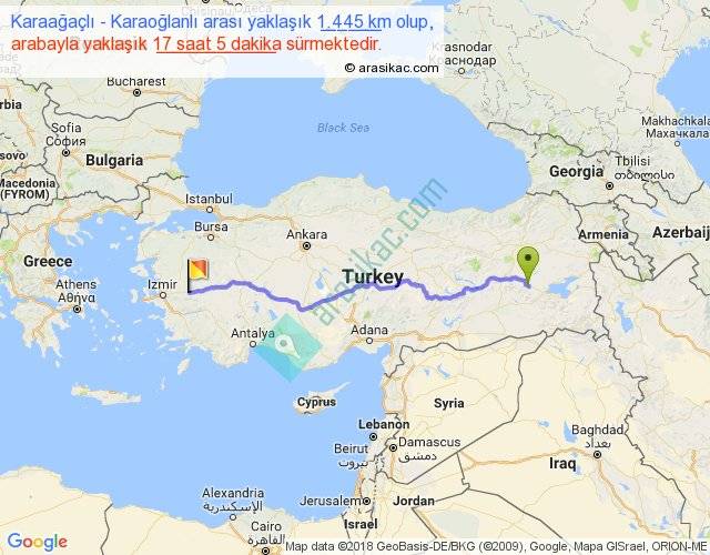 Karaağaçlı - Karaoğlanlı arası yaklaşık olarak 90 km/h ile yukarıda belirtilen sürede olup, iki yerin kuş uçuşu uzaklığı (mesafesi) 1160'dir. Eğer belirtilen yerler arasında uçak seferi var ise bu süre uçakla 1 saat 47 dakika'ya kadar düşebilir. Yolculuk otobüsle 22 saat 12 dakika sürmektedir.