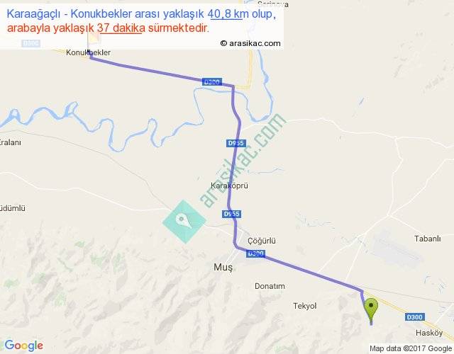 Karaağaçlı - Konukbekler arası yaklaşık olarak 90 km/h ile yukarıda belirtilen sürede olup, iki yerin kuş uçuşu uzaklığı (mesafesi) 33'dir. Yolculuk otobüsle 48 dakika sürmektedir.