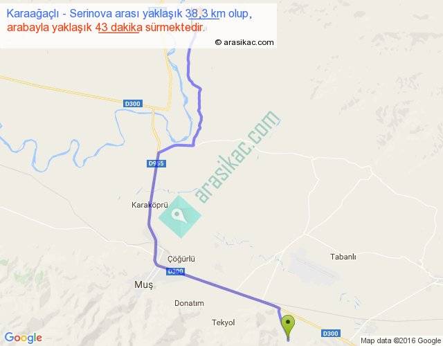 Karaağaçlı - Serinova arası yaklaşık olarak 90 km/h ile yukarıda belirtilen sürede olup, iki yerin kuş uçuşu uzaklığı (mesafesi) 28'dir. Yolculuk otobüsle 55 dakika sürmektedir.