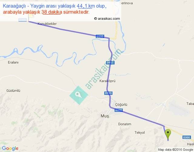 Karaağaçlı - Yaygin arası yaklaşık olarak 90 km/h ile yukarıda belirtilen sürede olup, iki yerin kuş uçuşu uzaklığı (mesafesi) 36'dir. Yolculuk otobüsle 49 dakika sürmektedir.