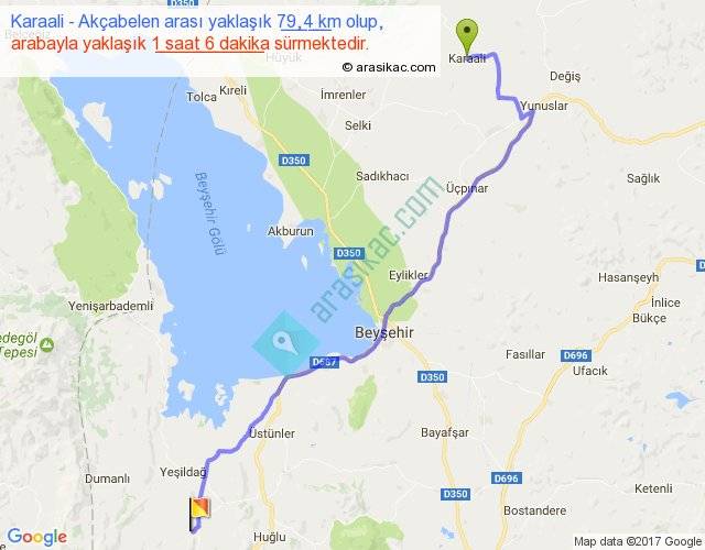 Karaali - Akçabelen arası yaklaşık olarak 90 km/h ile yukarıda belirtilen sürede olup, iki yerin kuş uçuşu uzaklığı (mesafesi) 60'dir. Yolculuk otobüsle 1 saat 25 dakika sürmektedir.