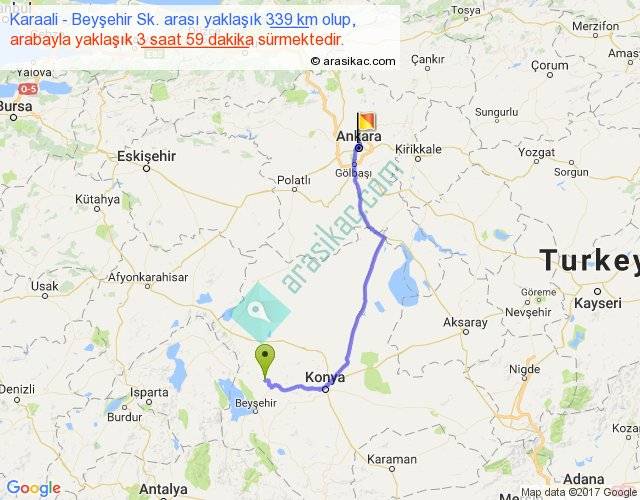 Karaali - Beyşehir Sk. arası yaklaşık olarak 90 km/h ile yukarıda belirtilen sürede olup, iki yerin kuş uçuşu uzaklığı (mesafesi) 241'dir. Yolculuk otobüsle 5 saat 10 dakika sürmektedir.