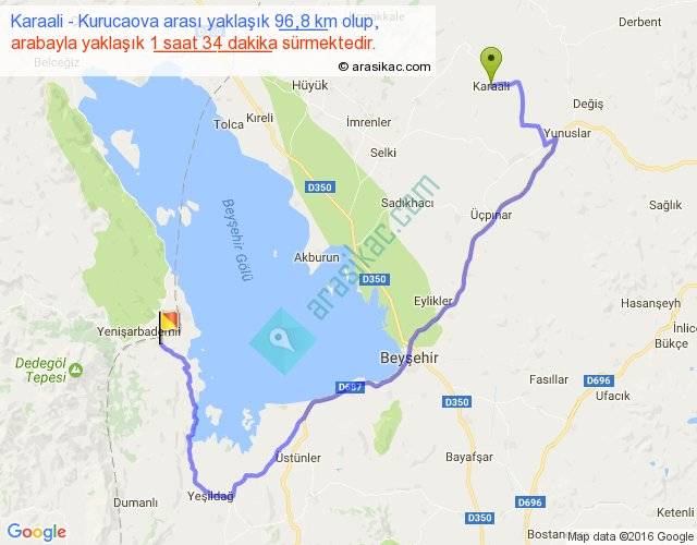 Karaali - Kurucaova arası yaklaşık olarak 90 km/h ile yukarıda belirtilen sürede olup, iki yerin kuş uçuşu uzaklığı (mesafesi) 46'dir. Yolculuk otobüsle 2 saat 2 dakika sürmektedir.