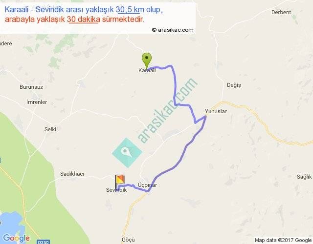 Karaali - Sevindik arası yaklaşık olarak 90 km/h ile yukarıda belirtilen sürede olup, iki yerin kuş uçuşu uzaklığı (mesafesi) 15'dir. Yolculuk otobüsle 39 dakika sürmektedir.
