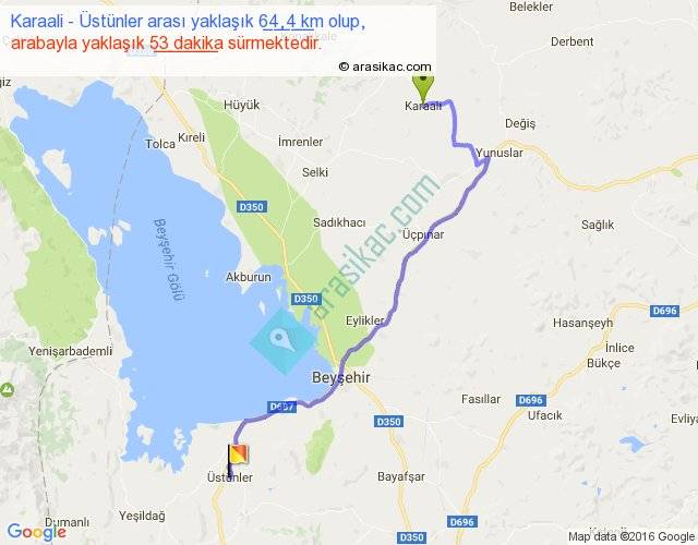 Karaali - Üstünler arası yaklaşık olarak 90 km/h ile yukarıda belirtilen sürede olup, iki yerin kuş uçuşu uzaklığı (mesafesi) 46'dir. Yolculuk otobüsle 1 saat 8 dakika sürmektedir.