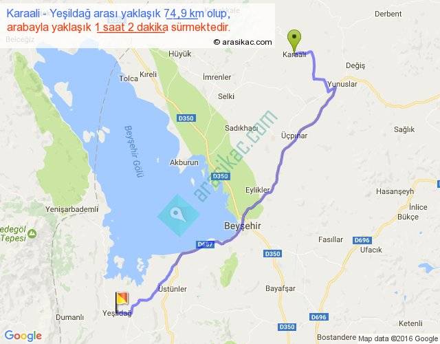 Karaali - Yeşildağ arası yaklaşık olarak 90 km/h ile yukarıda belirtilen sürede olup, iki yerin kuş uçuşu uzaklığı (mesafesi) 55'dir. Yolculuk otobüsle 1 saat 20 dakika sürmektedir.