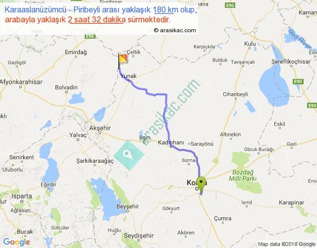 Karaaslanüzümcü - Piribeyli arası yaklaşık olarak 90 km/h ile yukarıda belirtilen sürede olup, iki yerin kuş uçuşu uzaklığı (mesafesi) 144'dir. Yolculuk otobüsle 3 saat 17 dakika sürmektedir.