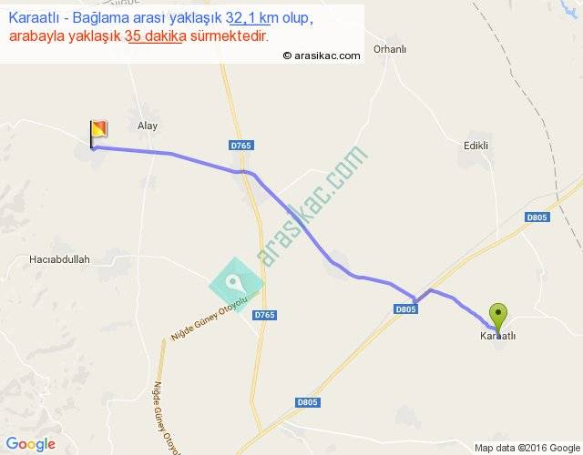 Karaatlı - Bağlama arası yaklaşık olarak 90 km/h ile yukarıda belirtilen sürede olup, iki yerin kuş uçuşu uzaklığı (mesafesi) 29'dir. Yolculuk otobüsle 45 dakika sürmektedir.