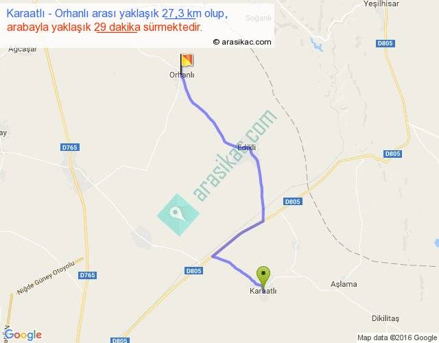 Karaatlı - Orhanlı arası yaklaşık olarak 90 km/h ile yukarıda belirtilen sürede olup, iki yerin kuş uçuşu uzaklığı (mesafesi) 20'dir. Yolculuk otobüsle 37 dakika sürmektedir.