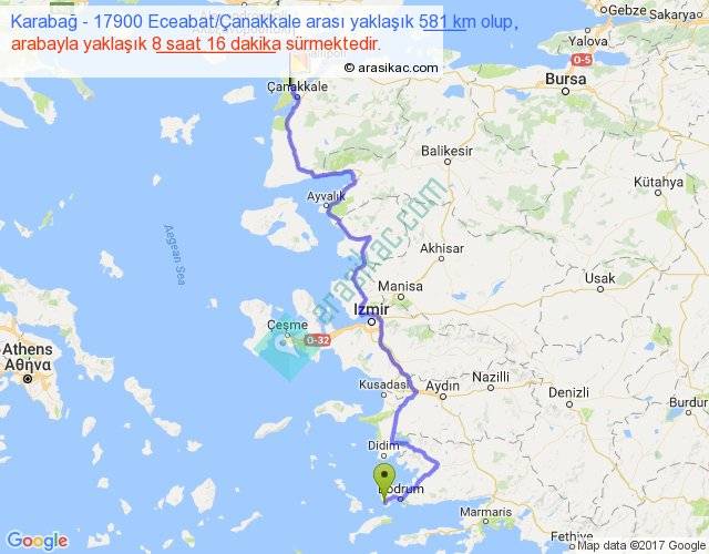 Karabağ - 17900 Eceabat Çanakkale arası yaklaşık olarak 90 km/h ile yukarıda belirtilen sürede olup, iki yerin kuş uçuşu uzaklığı (mesafesi) 365'dir. Eğer belirtilen yerler arasında uçak seferi var ise bu süre uçakla 33 dakika'ya kadar düşebilir. Yolculuk otobüsle 10 saat 44 dakika sürmektedir.