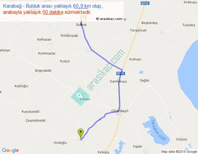 Karabağ - Bulduk arası yaklaşık olarak 90 km/h ile yukarıda belirtilen sürede olup, iki yerin kuş uçuşu uzaklığı (mesafesi) 44'dir. Yolculuk otobüsle 1 saat 5 dakika sürmektedir.