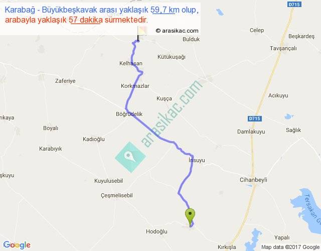 Karabağ - Büyükbeşkavak arası yaklaşık olarak 90 km/h ile yukarıda belirtilen sürede olup, iki yerin kuş uçuşu uzaklığı (mesafesi) 45'dir. Yolculuk otobüsle 1 saat 14 dakika sürmektedir.