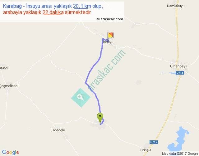 Karabağ - İnsuyu arası yaklaşık olarak 90 km/h ile yukarıda belirtilen sürede olup, iki yerin kuş uçuşu uzaklığı (mesafesi) 16'dir. Yolculuk otobüsle 28 dakika sürmektedir.