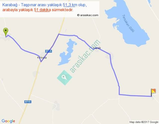Karabağ - Taşpınar arası yaklaşık olarak 90 km/h ile yukarıda belirtilen sürede olup, iki yerin kuş uçuşu uzaklığı (mesafesi) 38'dir. Yolculuk otobüsle 1 saat 6 dakika sürmektedir.