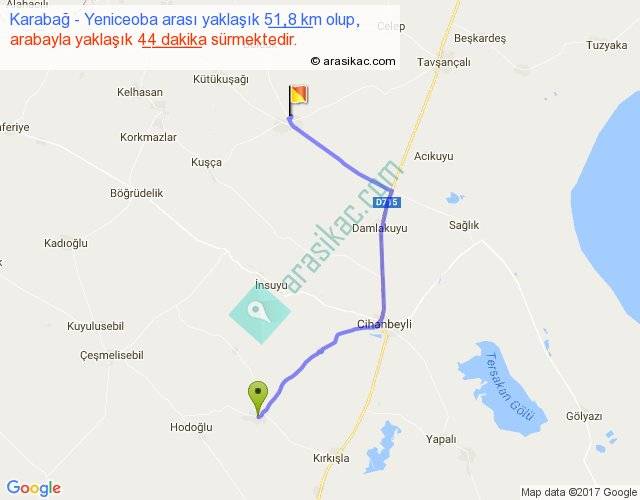 Karabağ - Yeniceoba arası yaklaşık olarak 90 km/h ile yukarıda belirtilen sürede olup, iki yerin kuş uçuşu uzaklığı (mesafesi) 36'dir. Yolculuk otobüsle 57 dakika sürmektedir.