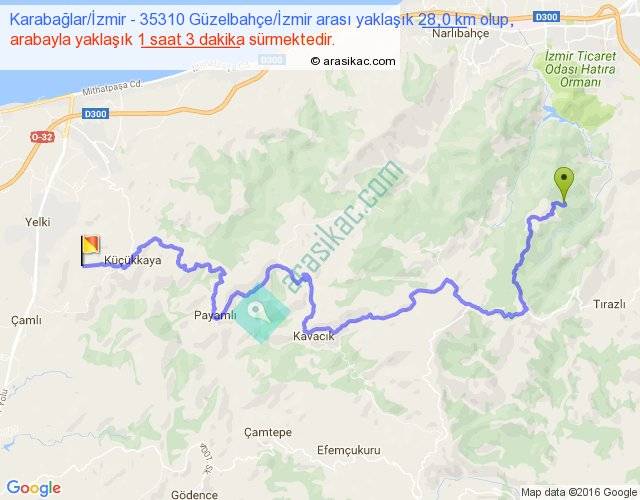 Karabağlar İzmir - 35310 Güzelbahçe İzmir arası yaklaşık olarak 90 km/h ile yukarıda belirtilen sürede olup, iki yerin kuş uçuşu uzaklığı (mesafesi) 14'dir. Yolculuk otobüsle 1 saat 19 dakika sürmektedir.