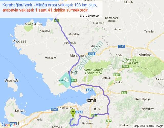 Karabağlar İzmir - Aliağa arası yaklaşık olarak 90 km/h ile yukarıda belirtilen sürede olup, iki yerin kuş uçuşu uzaklığı (mesafesi) 50'dir. Yolculuk otobüsle 2 saat 11 dakika sürmektedir.