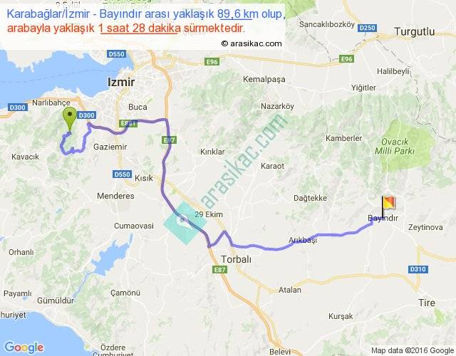 Karabağlar İzmir - Bayındır arası yaklaşık olarak 90 km/h ile yukarıda belirtilen sürede olup, iki yerin kuş uçuşu uzaklığı (mesafesi) 54'dir. Yolculuk otobüsle 1 saat 54 dakika sürmektedir.
