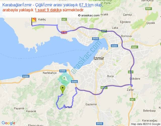 Karabağlar İzmir - Çiğli İzmir arası yaklaşık olarak 90 km/h ile yukarıda belirtilen sürede olup, iki yerin kuş uçuşu uzaklığı (mesafesi) 18'dir. Yolculuk otobüsle 1 saat 29 dakika sürmektedir.