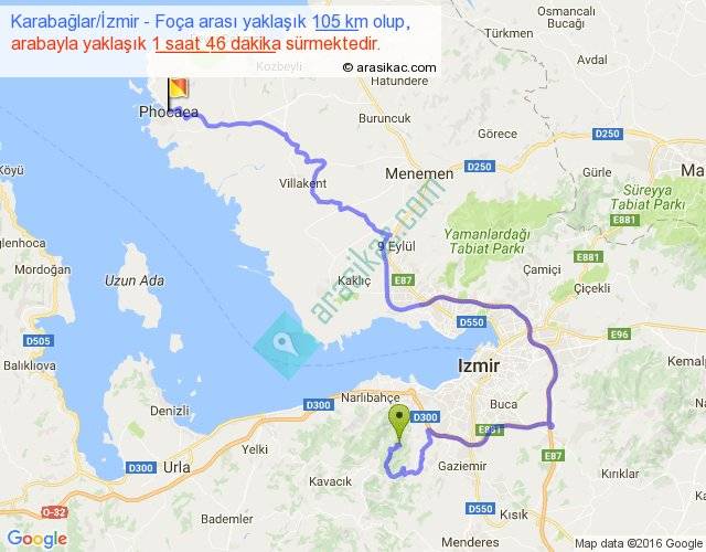 Karabağlar İzmir - Foça arası yaklaşık olarak 90 km/h ile yukarıda belirtilen sürede olup, iki yerin kuş uçuşu uzaklığı (mesafesi) 44'dir. Yolculuk otobüsle 2 saat 17 dakika sürmektedir.