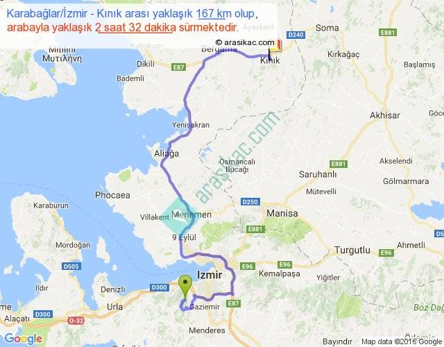 Karabağlar İzmir - Kınık arası yaklaşık olarak 90 km/h ile yukarıda belirtilen sürede olup, iki yerin kuş uçuşu uzaklığı (mesafesi) 87'dir. Yolculuk otobüsle 3 saat 17 dakika sürmektedir.