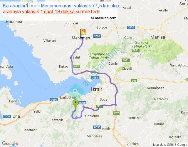 Karabağlar İzmir - Menemen arası yaklaşık olarak 90 km/h ile yukarıda belirtilen sürede olup, iki yerin kuş uçuşu uzaklığı (mesafesi) 29'dir. Yolculuk otobüsle 1 saat 42 dakika sürmektedir.